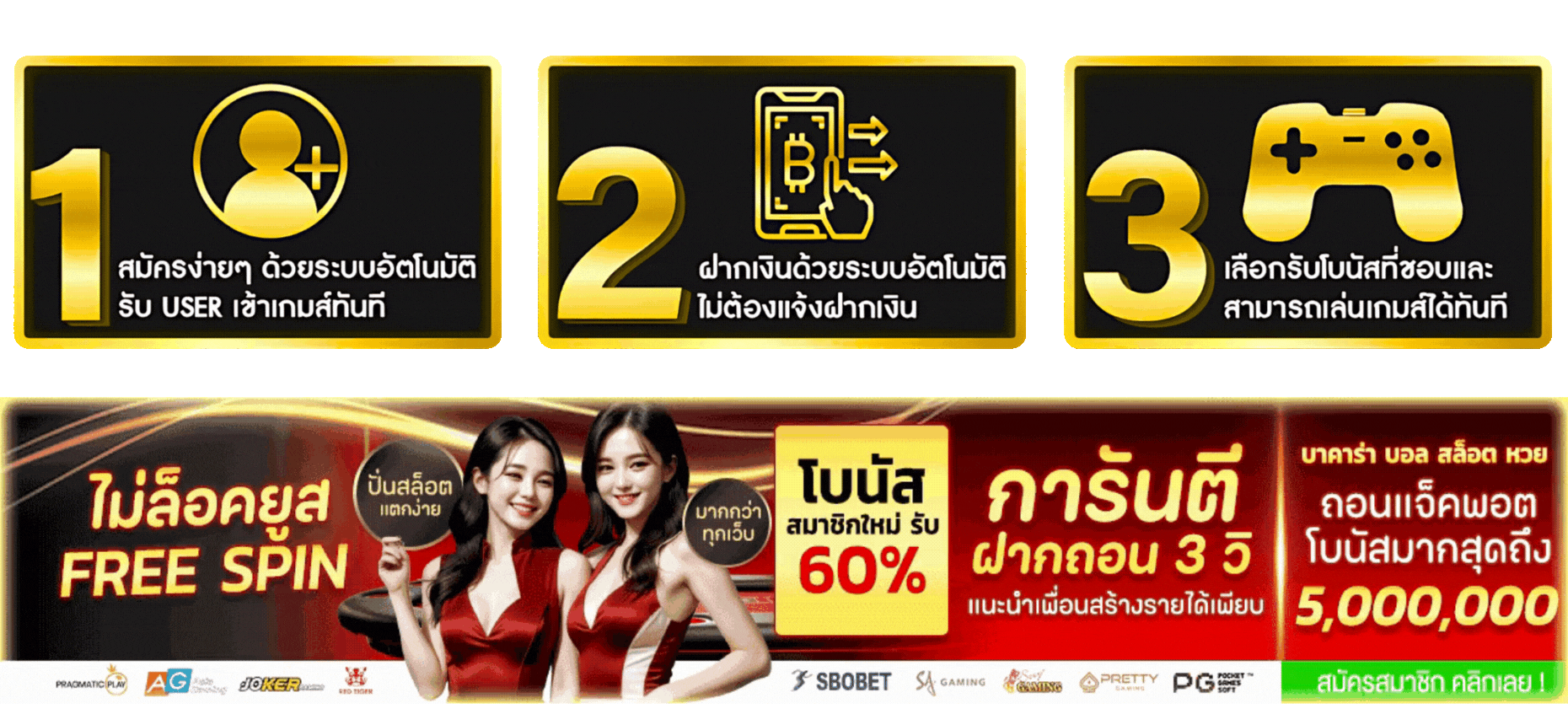 ตอบ : - มีโบนัสต้อนรับสมาชิกใหม่ 100% โปรโมชั่นคืนยอดเสีย 10% ทุกสัปดาห์ โบนัสแนะนำเพื่อน 20% และกิจกรรมแจกเครดิตฟรีประจำเดือน